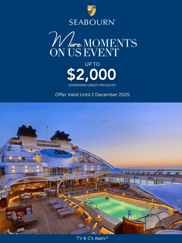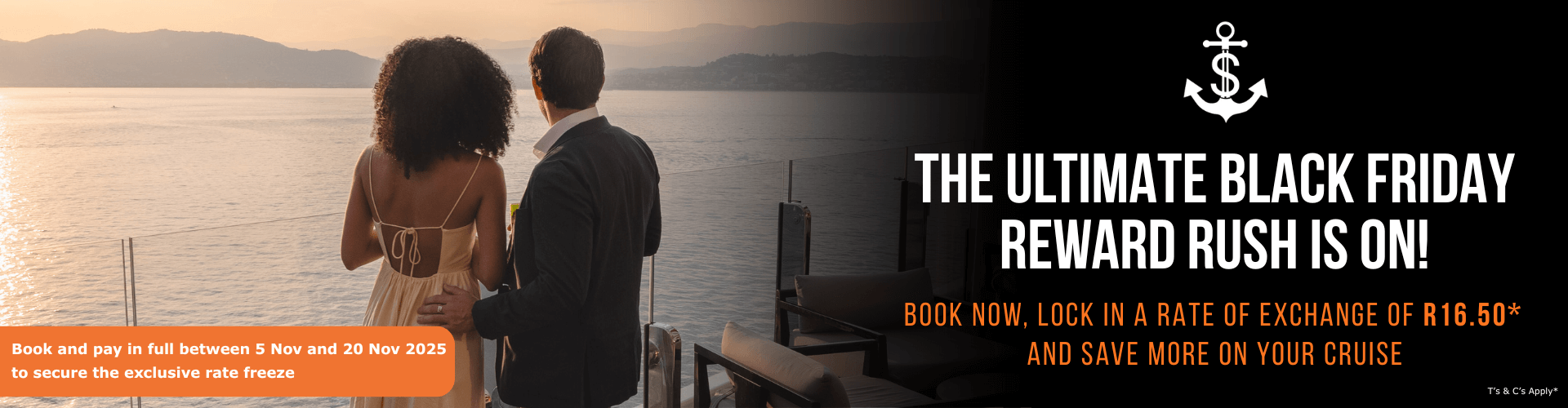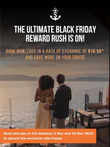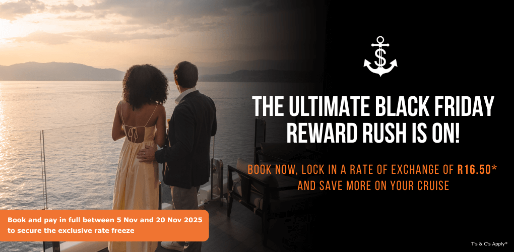 Applicable across all international cruise brands represented by Cruises International. Cruises International is the official representative of all brands featured on our website within Africa. Prices are subject to availability, capacity control, and rate of exchange fluctuations at the time of booking.